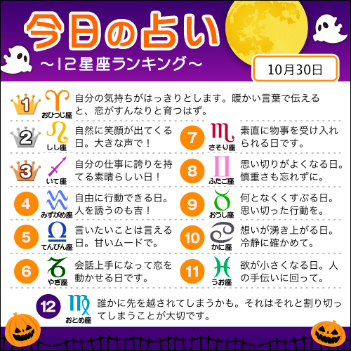占いtvニュース V Twitter 10月30日の12星座ランキング 1位 牡羊座 2位 獅子座 3位 射手座 すべての星座の恋愛運 仕事運 金運は こちら Https T Co 4nmagzi4tf 今日の運勢